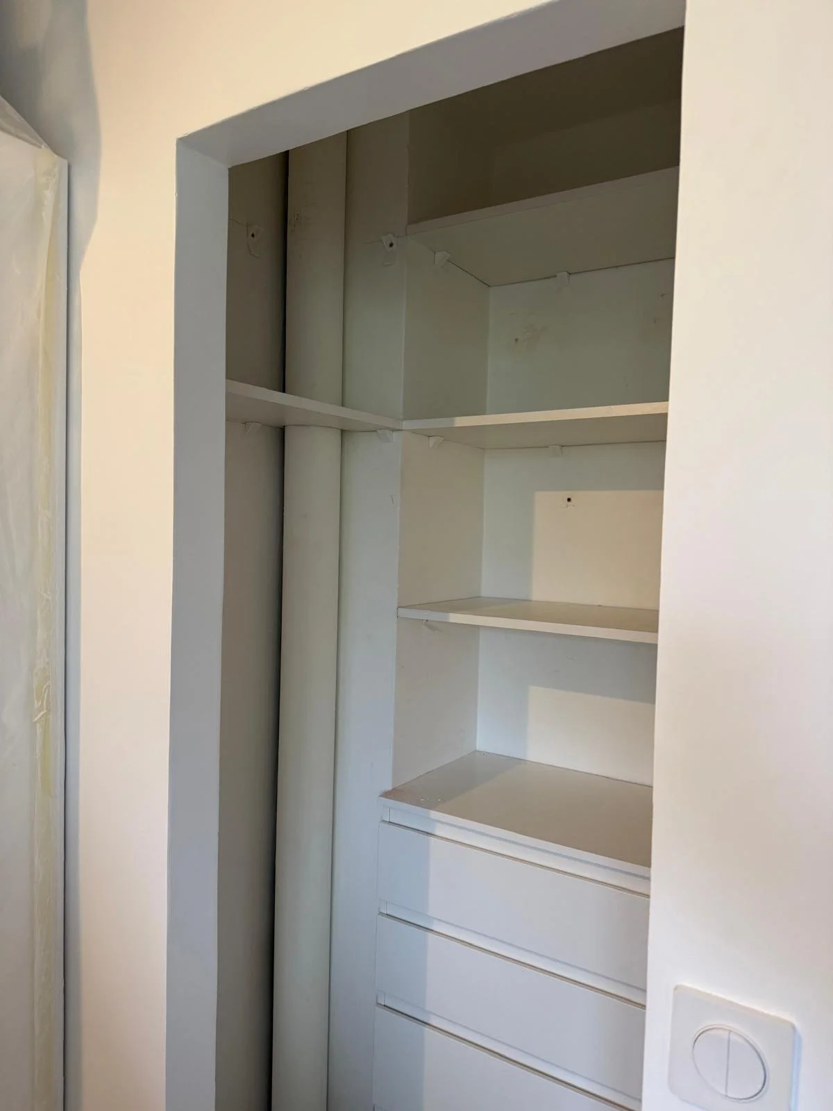 Travaux : étagères sur-mesure autour de la colonne d'évacuation dans le nouveau dressing.