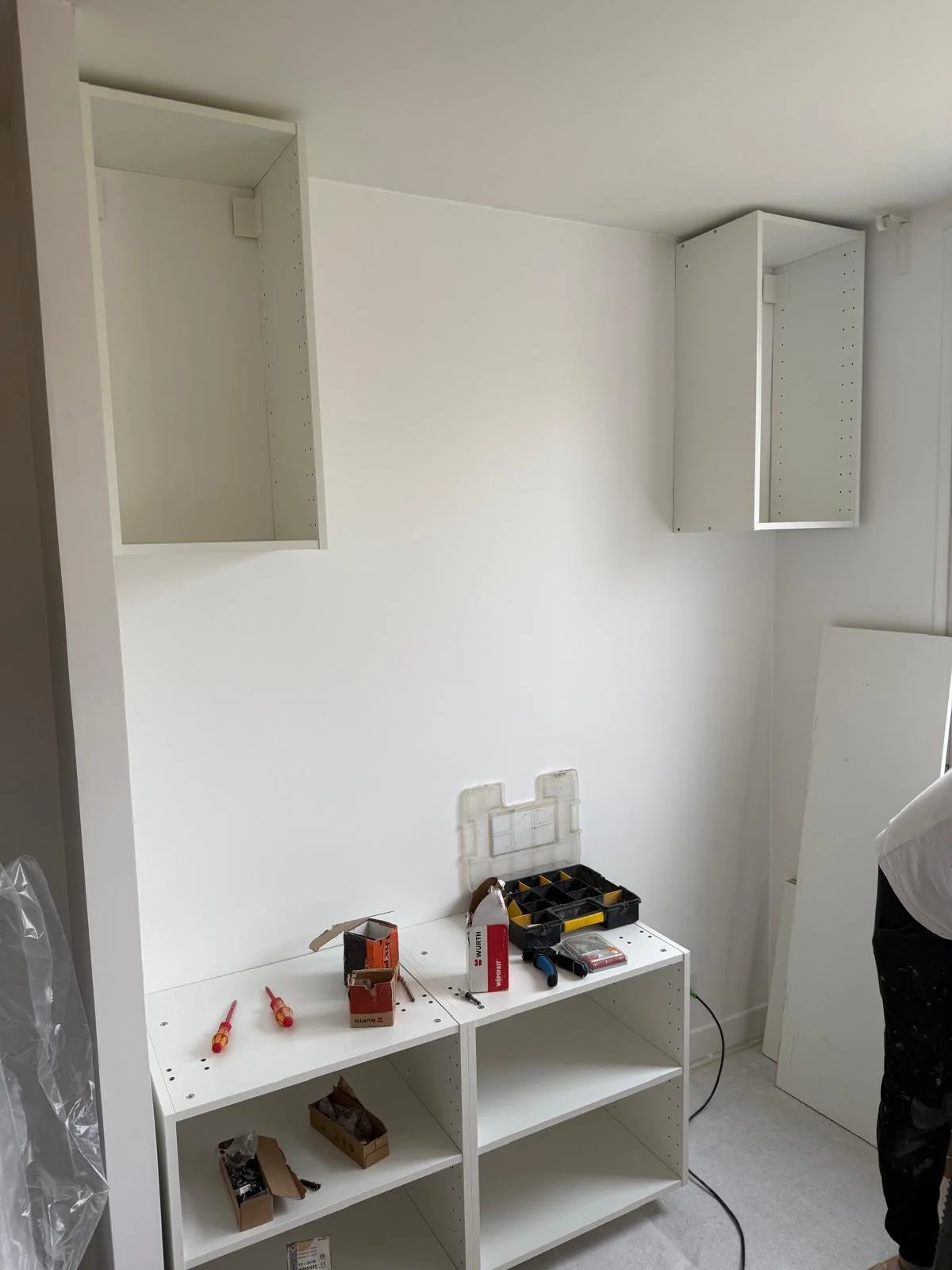 Travaux : pose des caissons IKEA pour l'aménagement du futur bureau. Plan de travail et intercalaires en stratifié motif chêne Hegger sur-mesure. Boutons La Quincaillerie.