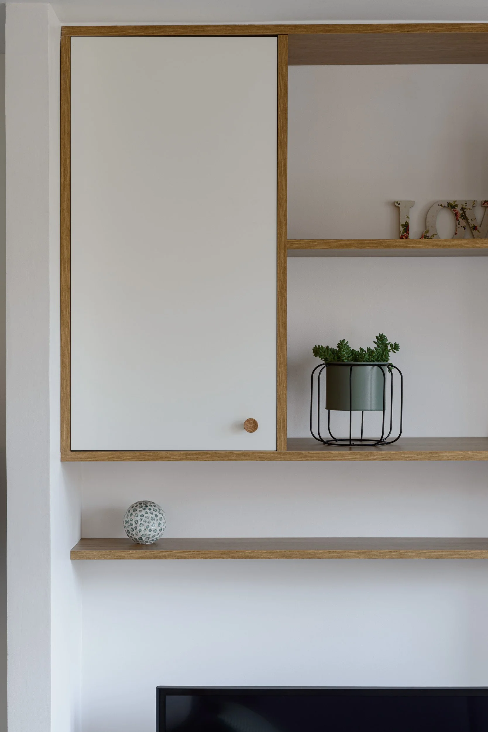 Nous avons repensé l’ensemble de l’espace en créant un dressing complet et en optimisant un placard sur mesure. Nous avons également conçu un espace bureau / TV, intégrant une bibliothèque et des rangements fermés.