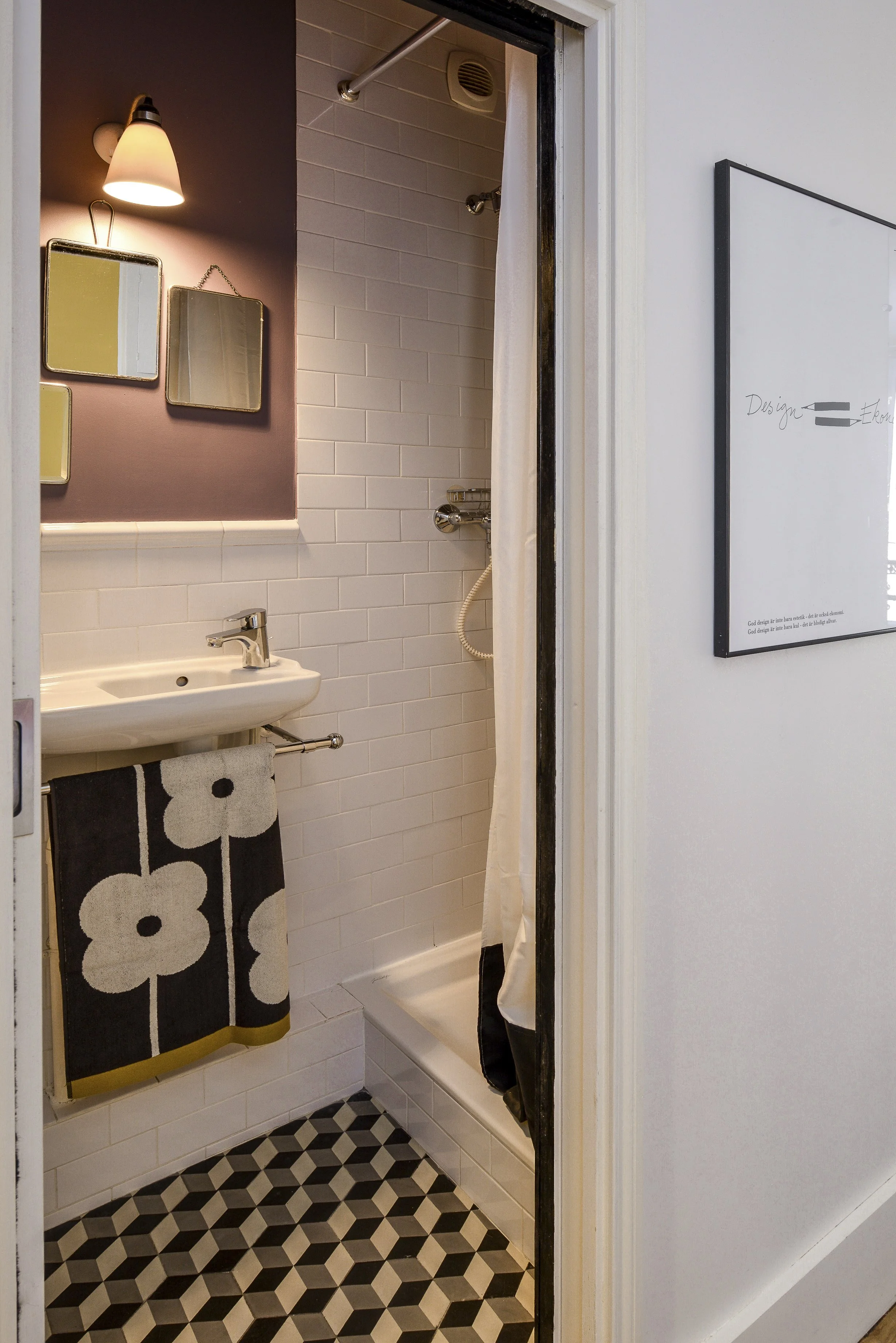 Exit la petite salle de bain qui donnait sur la porte d’entrée. Nous avons déplacé la salle d’eau côté chambre et créé une vraie entrée donnant sur le salon. La cuisine a été agrandie et optimisée. L’apport d’un manteau de cheminée sous la niche et d’une cimaise moulurée au séjour a redonné son âme et sa singularité à ce joli deux-pièces.